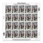 In the aftermath of September 11th, the U.S. Postal Service produced a semi-postal stamp which raised money for families affected by the terrorist attacks. It celebrated the heroism of America’s first responders and the resiliency of the nation by featuring the iconic image of three firefighters raising the American flag amid the rubble of the World Trade Center. This intact sheet of 20 stamps is a wonderful way to remember the heroes of 9/11.