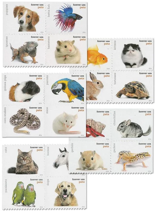 Stamp designs by Eric Issel??e showcase 20 domesticated animals: puppies, betta fish, iguanas, hamsters, goldfish, parrots, guinea pigs, tortoises, rabbits, kittens, corn snakes, mice, hermit crabs, chinchillas, gerbils, dogs, parakeets, horses, cats, and geckos.