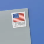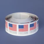 The stamp bears a straightforward graphic design of red, white, and blue with the word FREEDOM below it in gray. The flag serves as a visual reminder of the array of freedoms that Americans enjoy.